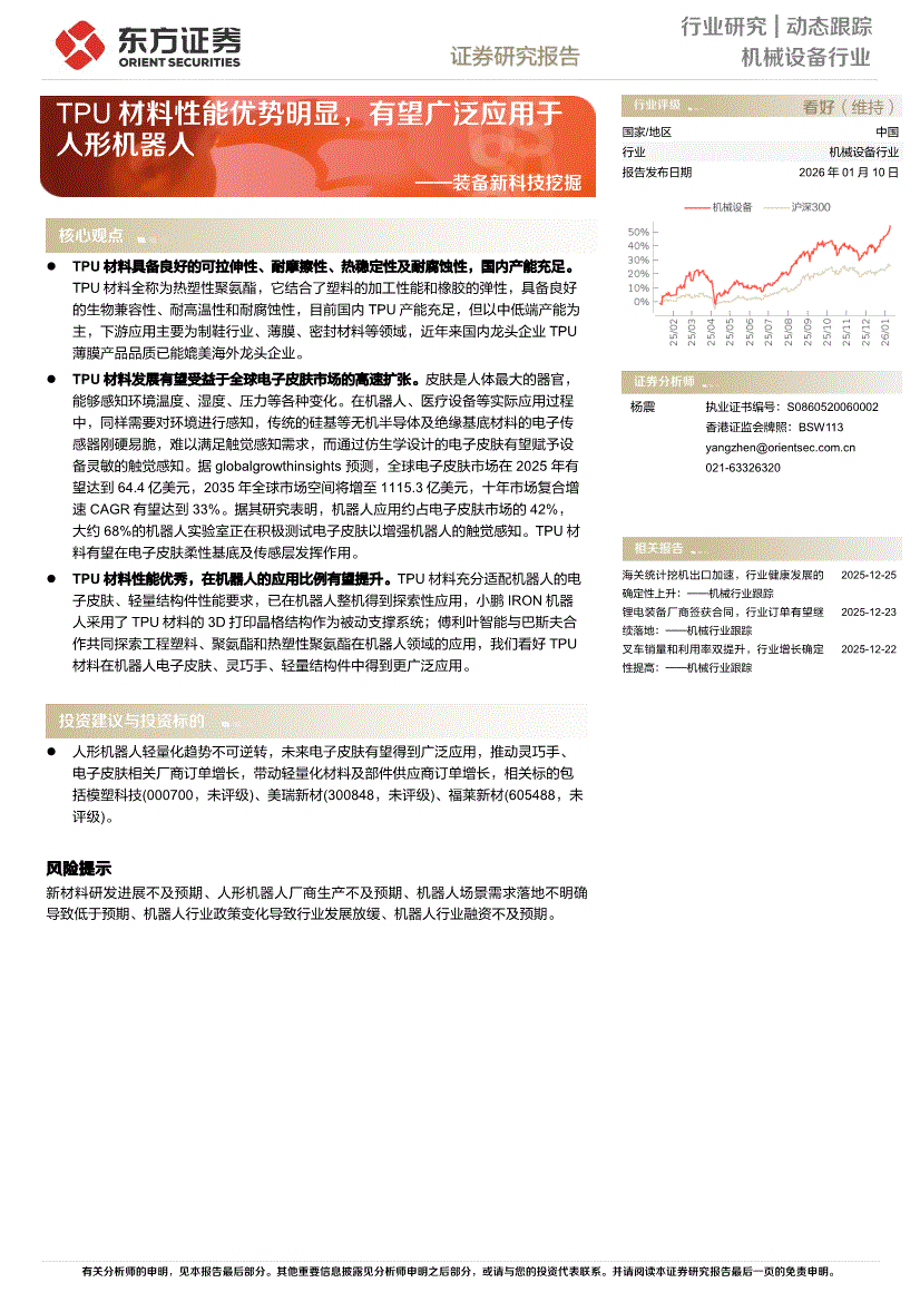 机械设备行业:东方证券-机械设备行业装备新科技挖掘:TPU材料性能优势明显,有望广泛应用于人形机器人-260110